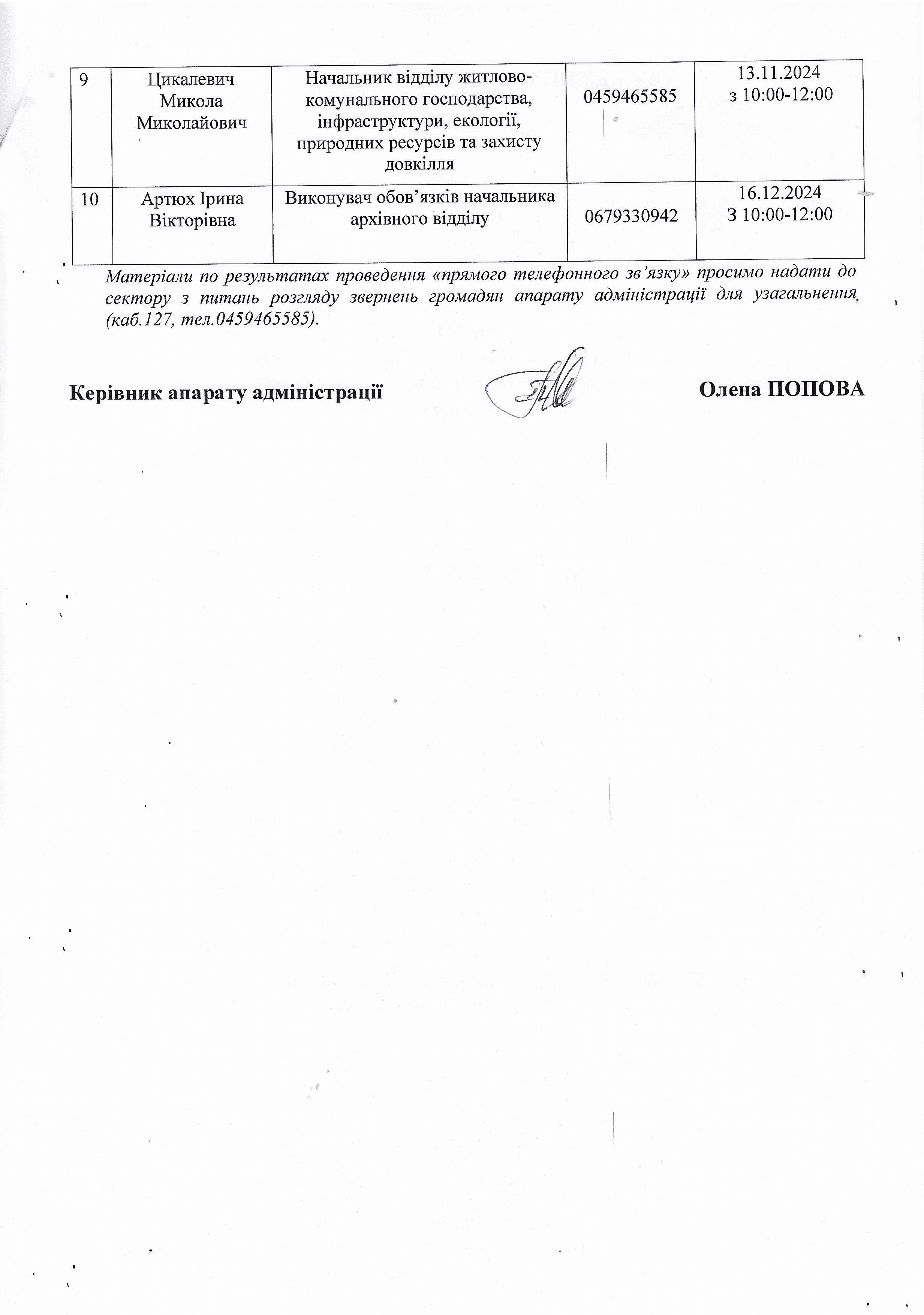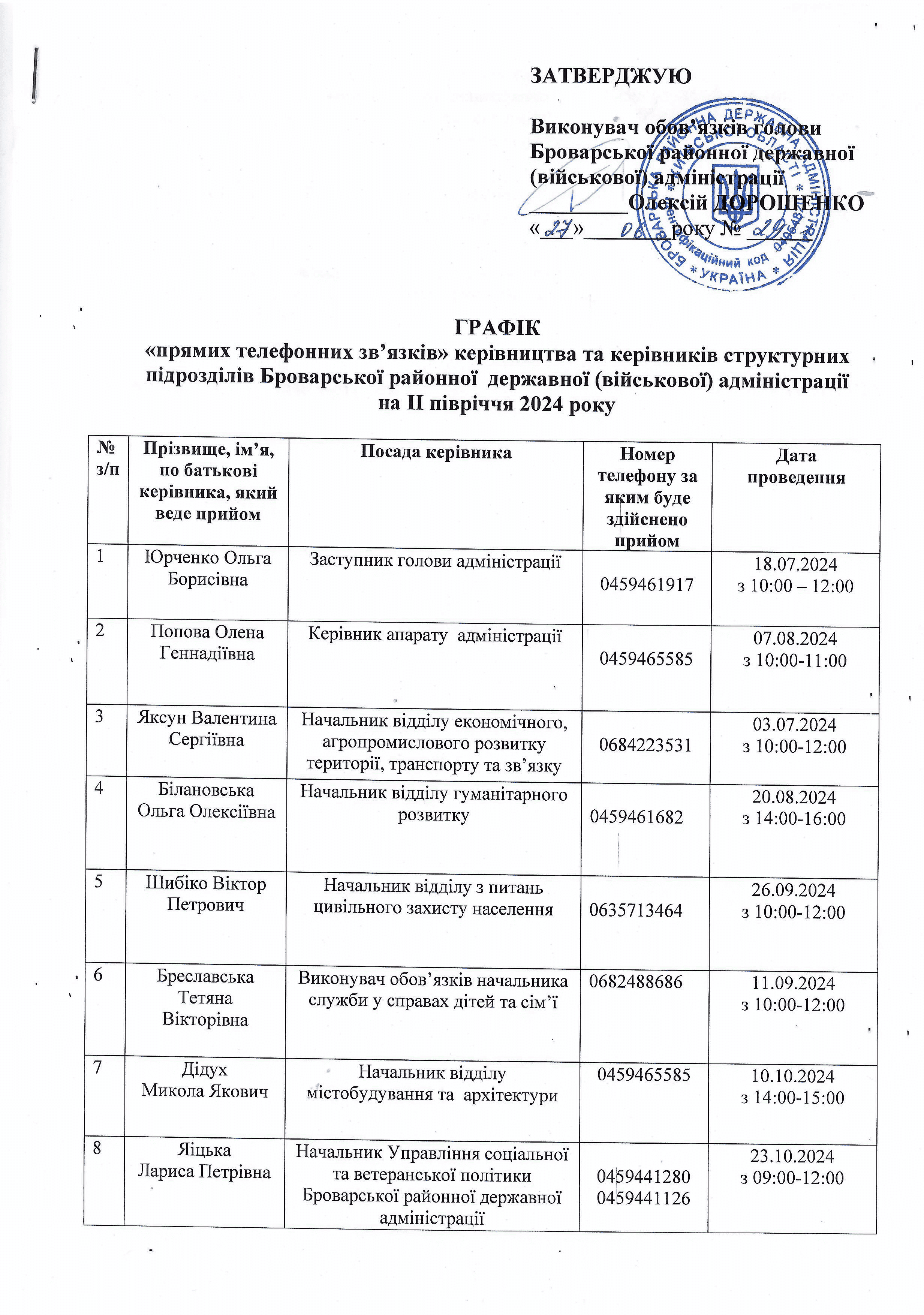 Графік прямих телефонних зв'язків Броварської районної державної (військової) адміністрації на ІІ півріччя 2024 року
