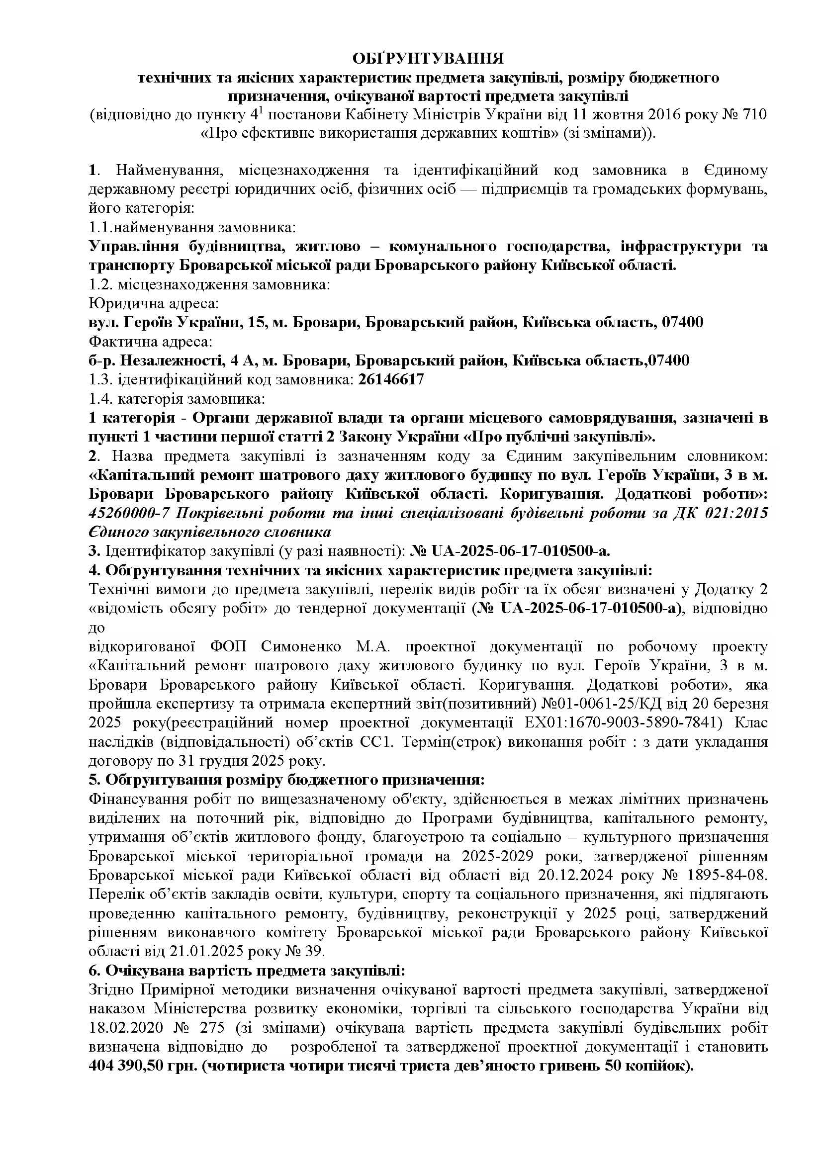 Капітальний ремонт шатрового даху житлового будинку по вул. Героїв України, 3 в м. Бровари Броварського району Київської області. Коригування. Додаткові роботи»: 45260000-7 Покрівельні роботи та інші спеціалізовані будівельні роботи за ДК 021:2015 Єдиного закупівельного словника.