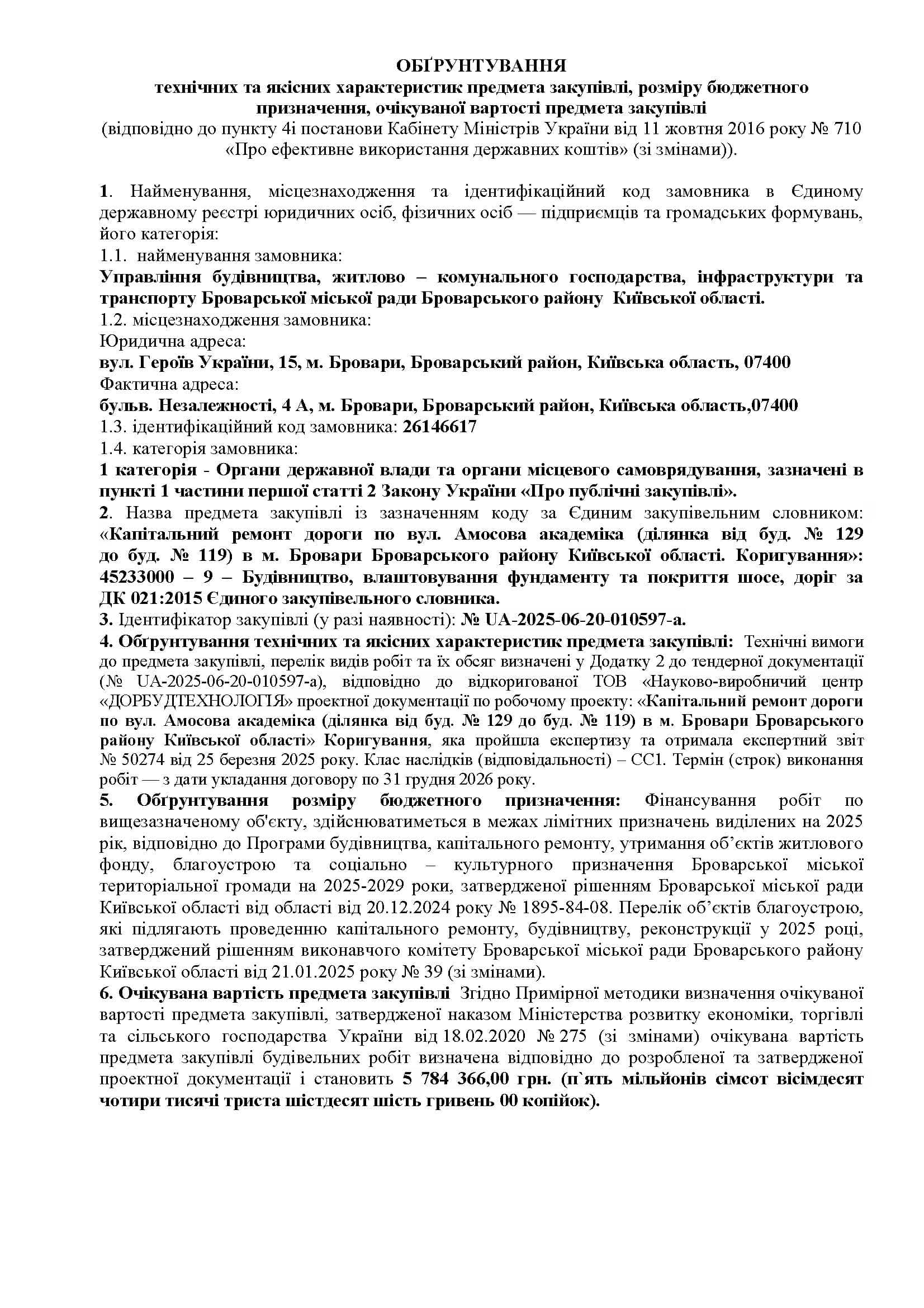 Капітальний ремонт дороги по вул. Амосова академіка (ділянка від буд. № 129 до буд. № 119) в м. Бровари Броварського району Київської області. Коригування»: 45233000 – 9 – Будівництво, влаштовування фундаменту та покриття шосе, доріг за ДК 021:2015 Єдиного закупівельного словника