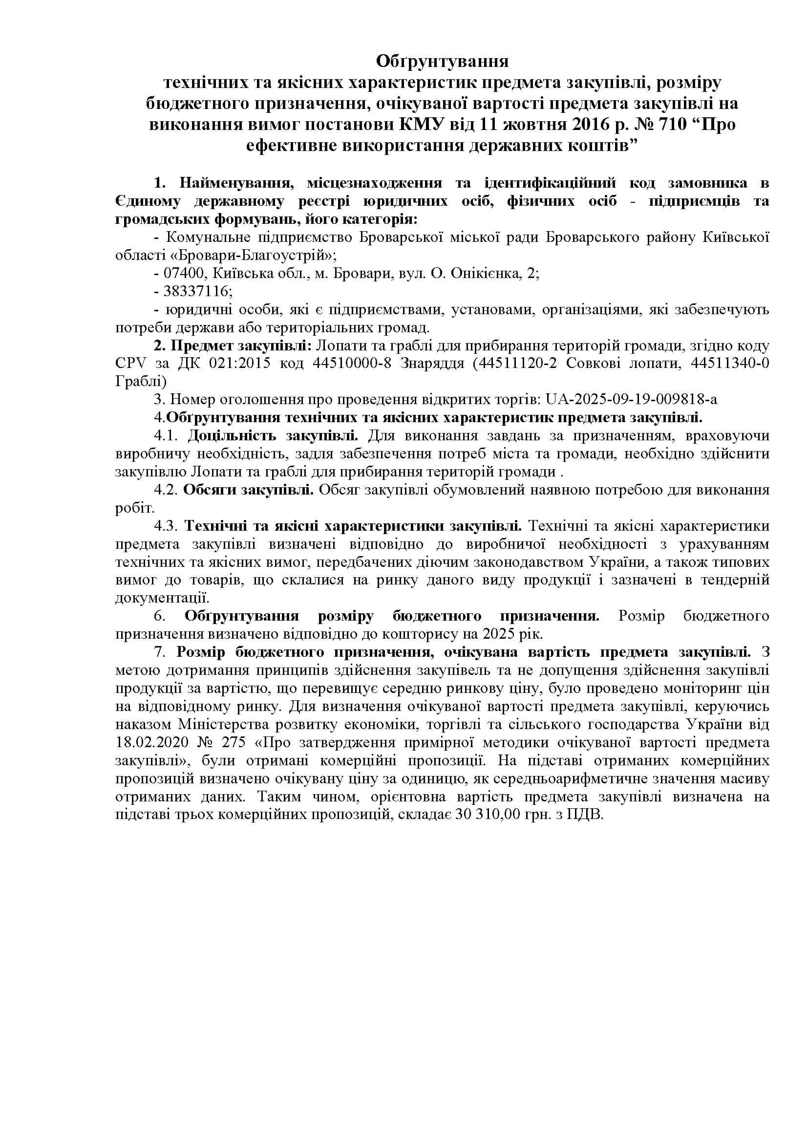 Лопати та граблі для прибирання територій громади, згідно коду CPV за ДК 021:2015 код 44510000-8 Знаряддя (44511120-2 Совкові лопати, 44511340-0 Граблі)