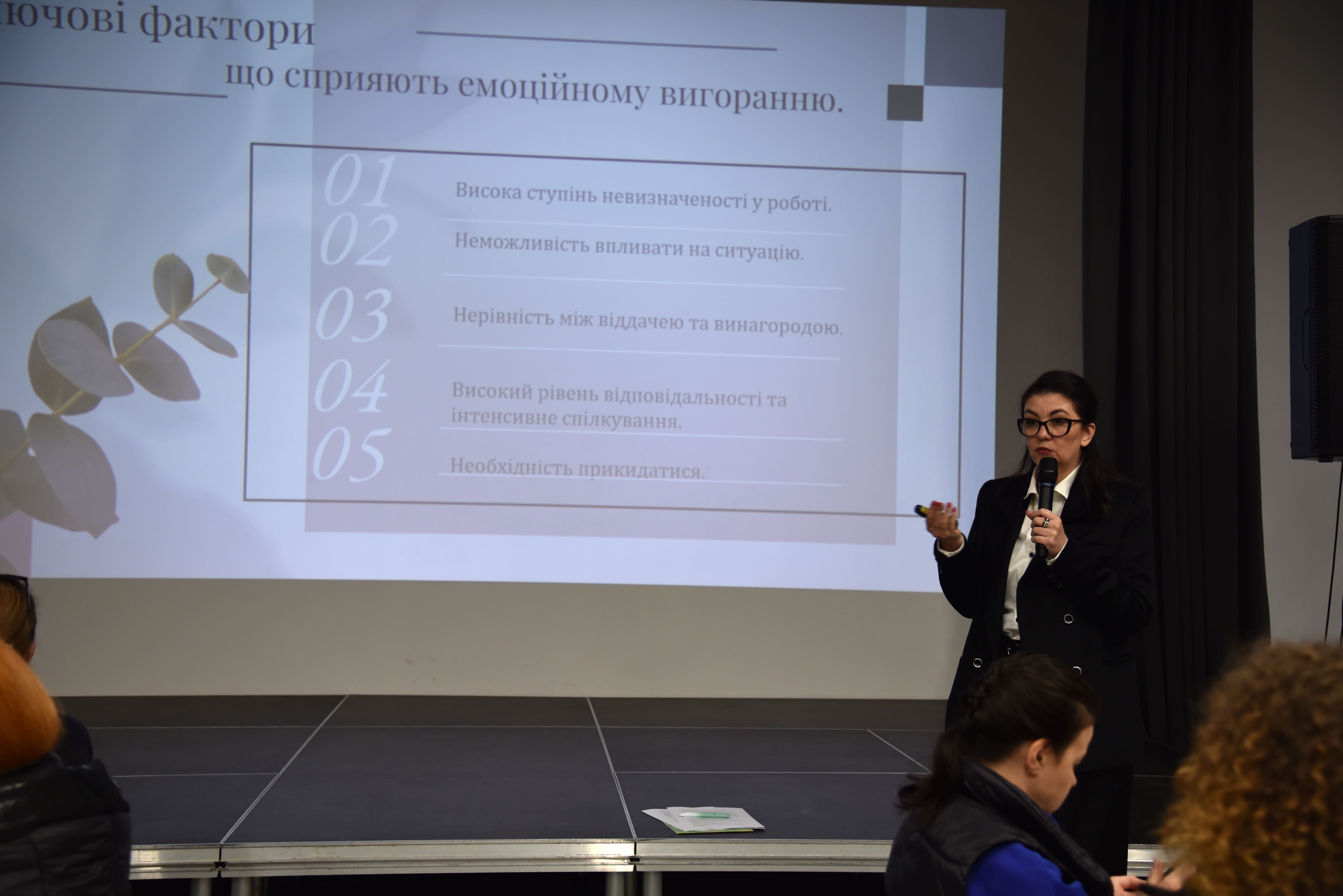 Також тренерка розповіла учасникам про конкретні стадії вигорання: кураж, захоплення, залежність, втому хронічний стрес, виснаження.