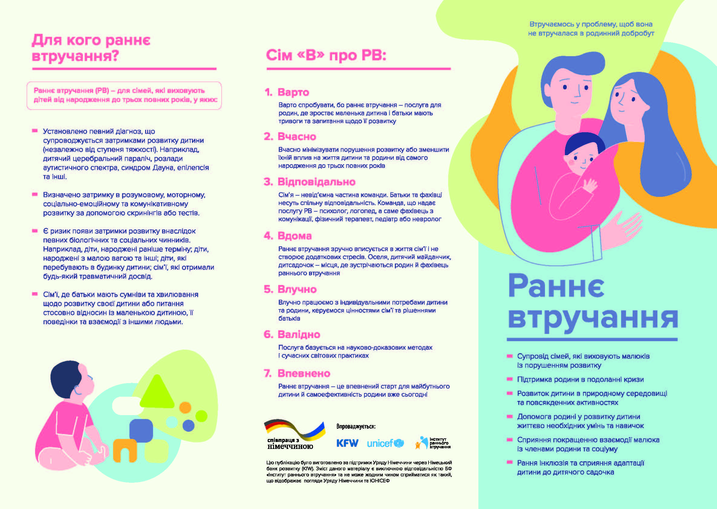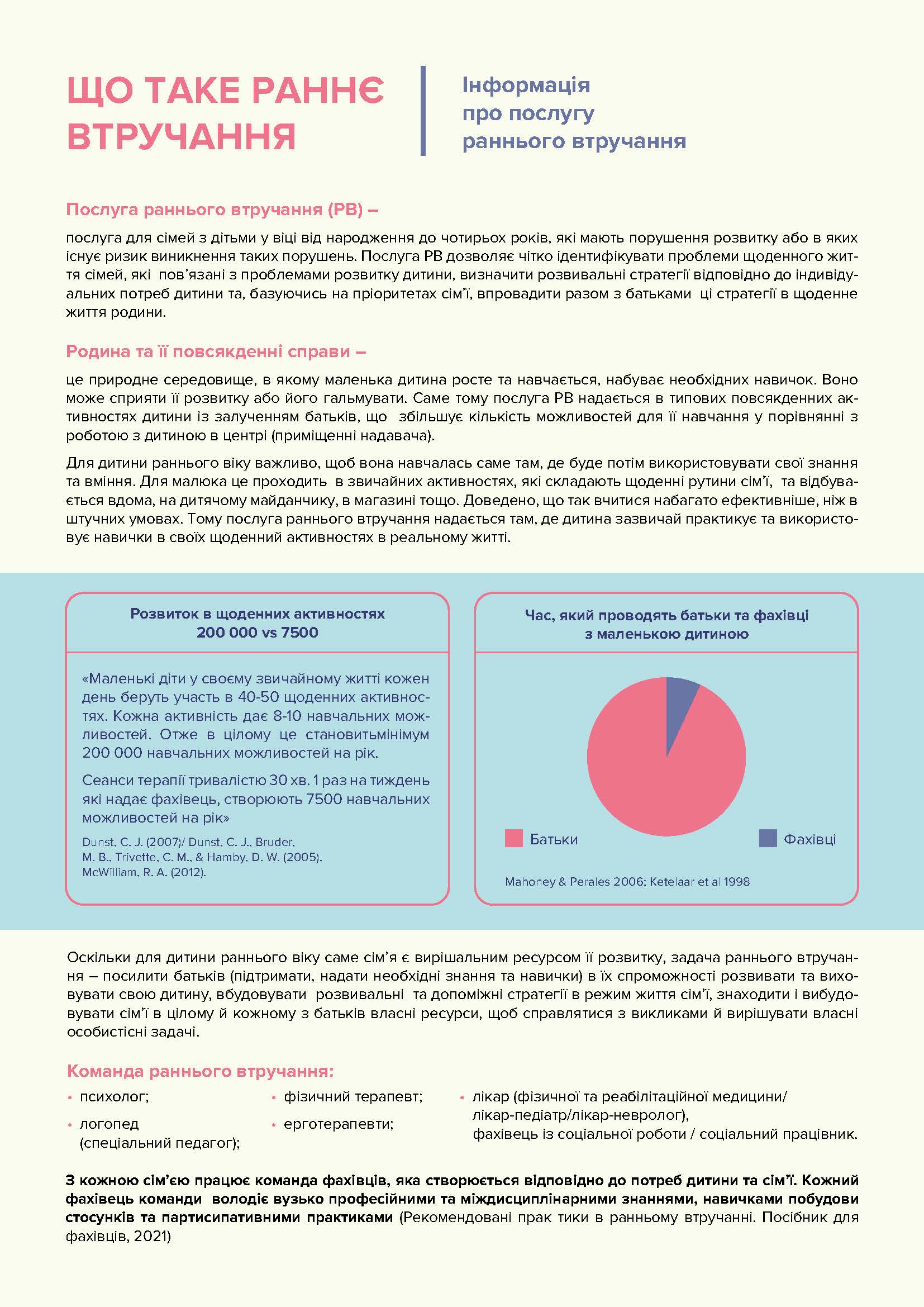 Послуга раннього втручання - це послуга для сімей з дітьми у віці від народження до чотирьох років, які мають порушення розвитку або в яких існує ризик виникнення таких порушень. Послуга раннього втручання дозволяє чітко ідентифікувати проблеми щоденного життя сімей, які пов’язані з проблемами розвитку дитини, визначити розвивальні стратегії відповідно до індивідуальних потреб дитини та, базуючись на пріоритетах сім’ї, впровадити разом з батьками ці стратегії в щоденне життя родини.