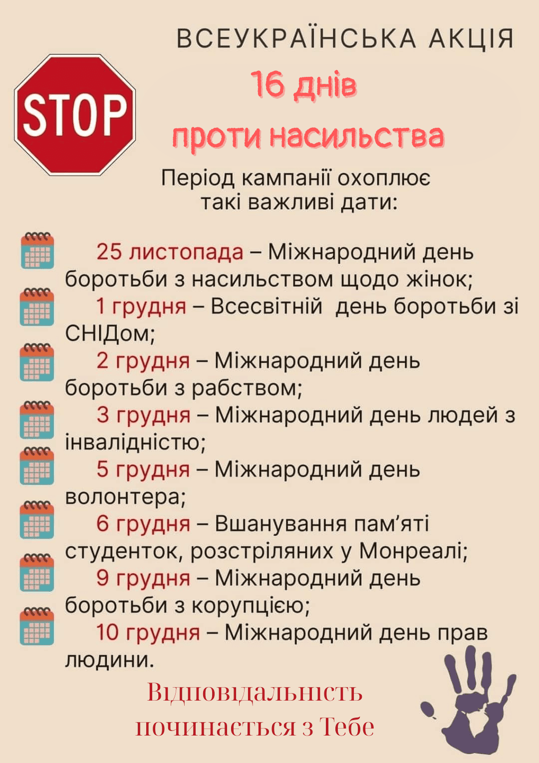 Щорічна Всеукраїнська акція «16 днів проти насильства» вкотре проводиться з метою привернення уваги до проблем подолання будь-яких форм насильства, у тому числі насильства в сім’ях, жорстокого поводження з дітьми, протидії торгівлі людьми та захисту прав жінок.