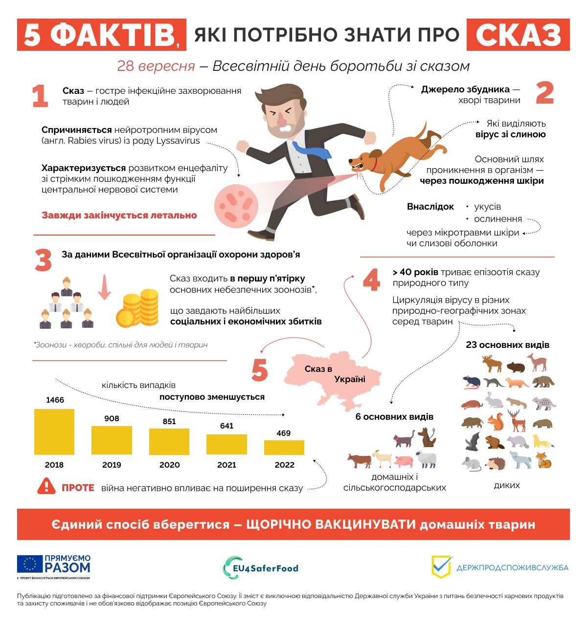 Сказ – це гостре інфекційне захворювання тварин і людей, яке викликає нейротропний вірус сказу. Воно є смертельно небезпечним, адже вражає центральну нервову систему людини. Якщо не отримати допомогу та почати лікування вчасно, летальність сказу сягає 100%.
