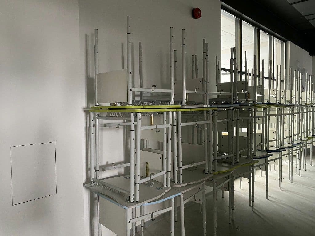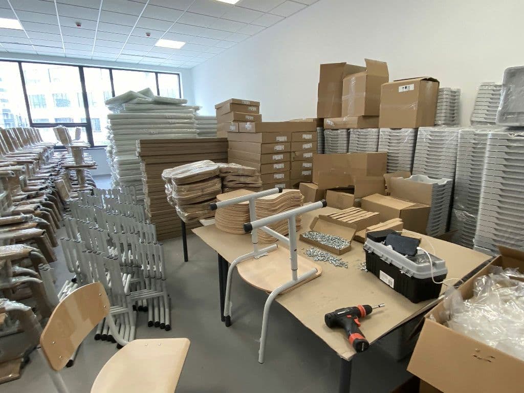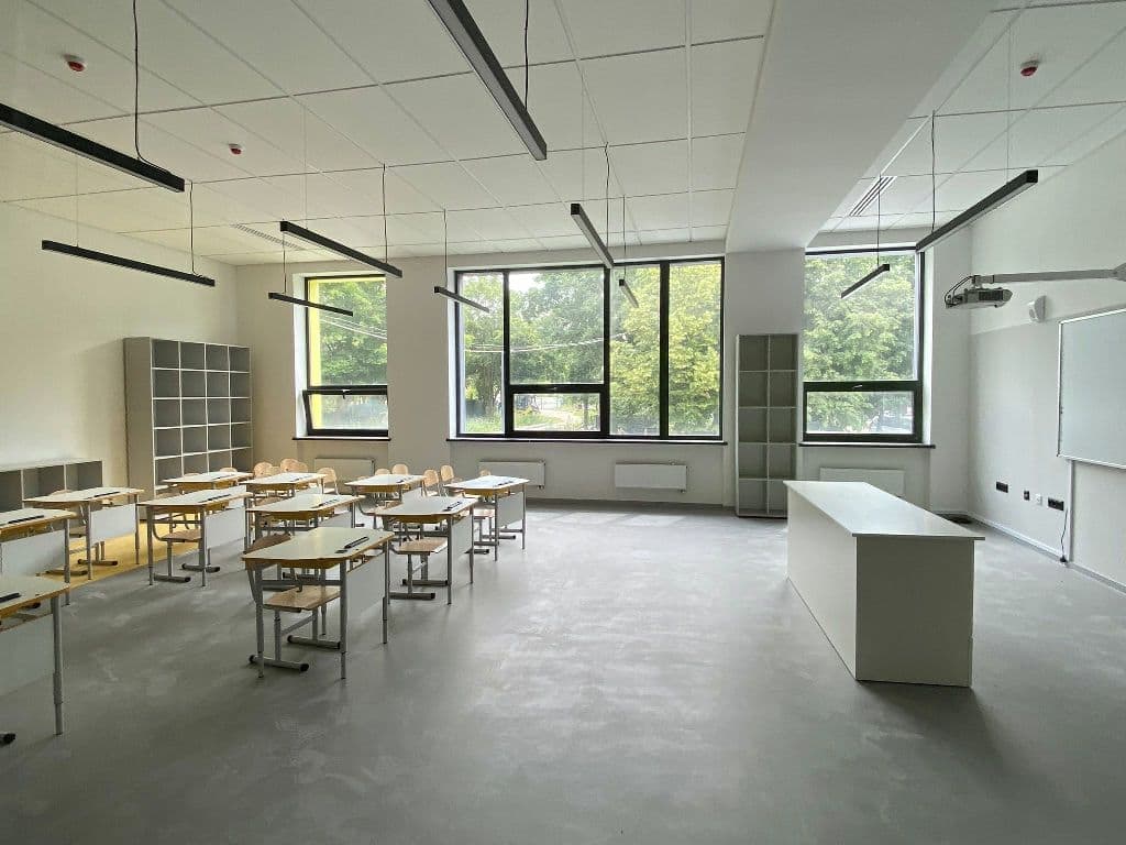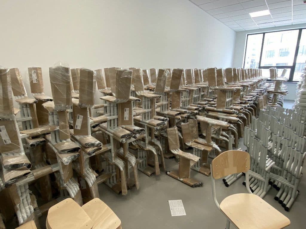 В школі продовжується збірка меблів для класних кімнат, розпочато монтаж покриття сцени в актовій залі, зовні облаштовується сонцезахист.