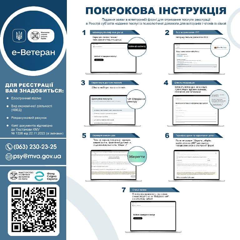 Щоб стати надавачем послуг та отримувати відшкодування від Мінветеранів, потрібно подати заяву до Реєстру суб’єктів надання послуг із надання психологічної допомоги для ветеранів та членів їх сімей (для другого та третього рівнів).