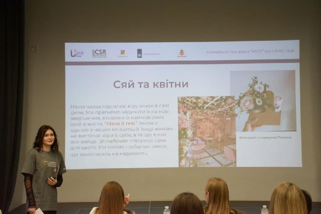 🙌У фінальному підчингу взяли участь 10 жінок, які презентували свої бізнес-проєкти: грумінг салон, незалежна оцінка майна ТОВ «ЄСП Капітал», психологічний центр по лікуванню розладів харчової поведінки, відкриття кав’ярень, інтернет магазин з речами для повітряних гімнасток/ів, український бренд виробів з льону «Таїна», жіночий клуб з психологом, аудит сервісу і бізнес процесів, інстаграм магазин дитячого одягу та аксесуарів.
